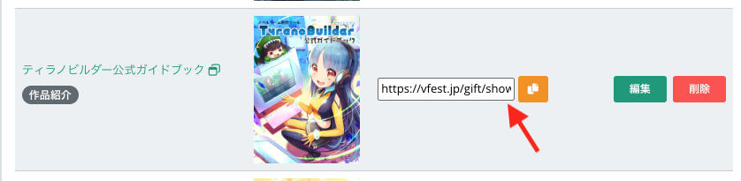 続いて、ギフト一覧画面から、「展示アイテムとして登録するとき用」のURLをコピーしておきます。