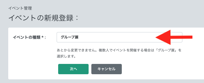 イベント作成画面から、グループ展を選択して「次へ」をクリックします。