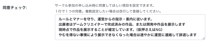 サークルの参加申し込みをする際に、サークルに同意してほしい項目を複数登録することができます。