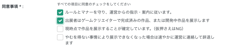 この状態で、サークル参加の登録をすると、次のように表示されて すべての項目に同意しないとサークル参加できないような表示が可能です。