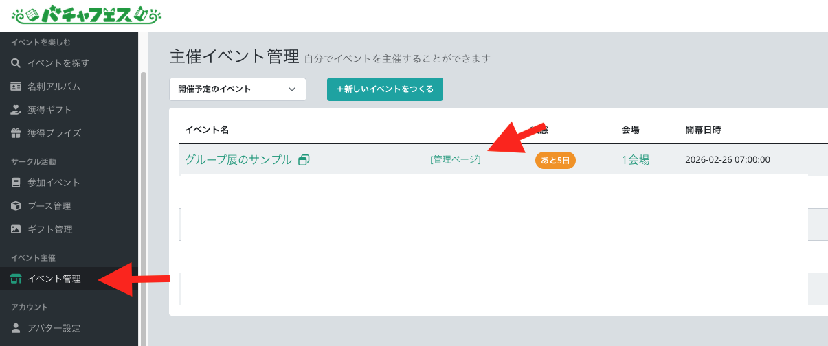 サークル参加者の状態を確認するには、イベント管理から「管理ページ」をクリックします