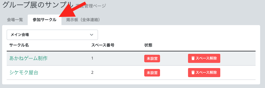 「参加サークル」タブをクリックすると、申込みが完了したサークル一覧が表示されるので、