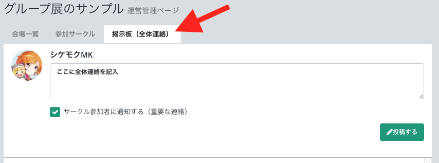 連絡等がある場合、「掲示板(全体連絡)」をご利用ください。